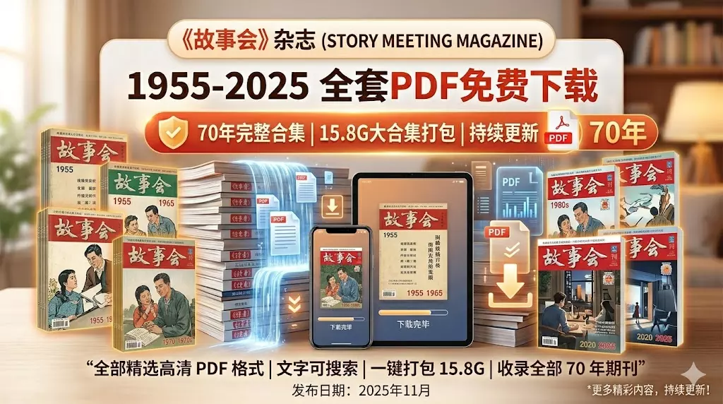 小黑前两天整理资源库的时候,翻到了一套《故事会》杂志的PDF合集——从1955年一直到2025年,整整70年的期刊,打包15.8G。当时就放下了手里所有的活,打开随便翻了一期,结果一口气看了两个小时。那种感觉怎么说呢,就像时光机突然把你拉回了小学放学后的那个下午,趴在同学课桌上偷偷看《故事会》,一边看一边防着班主任。